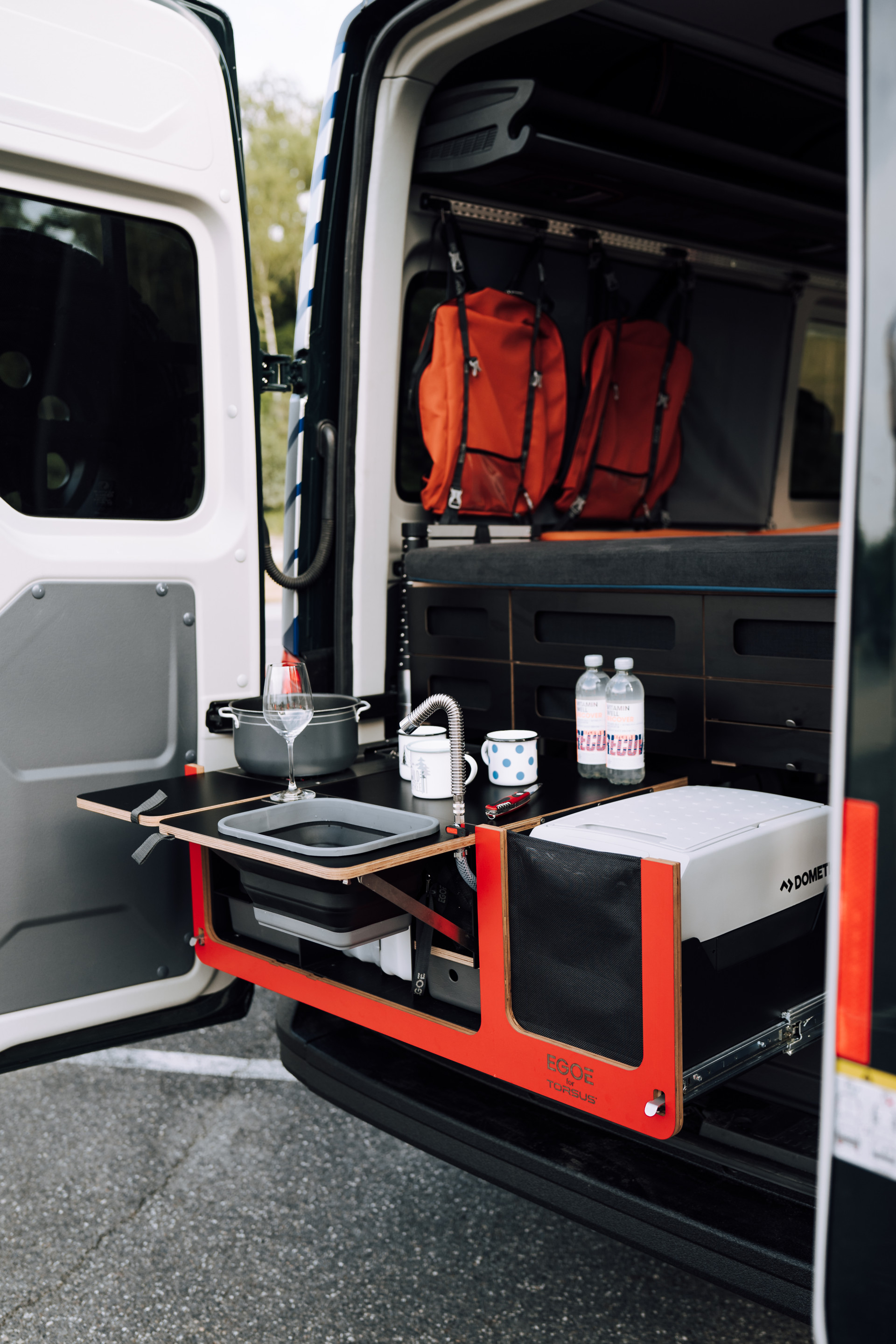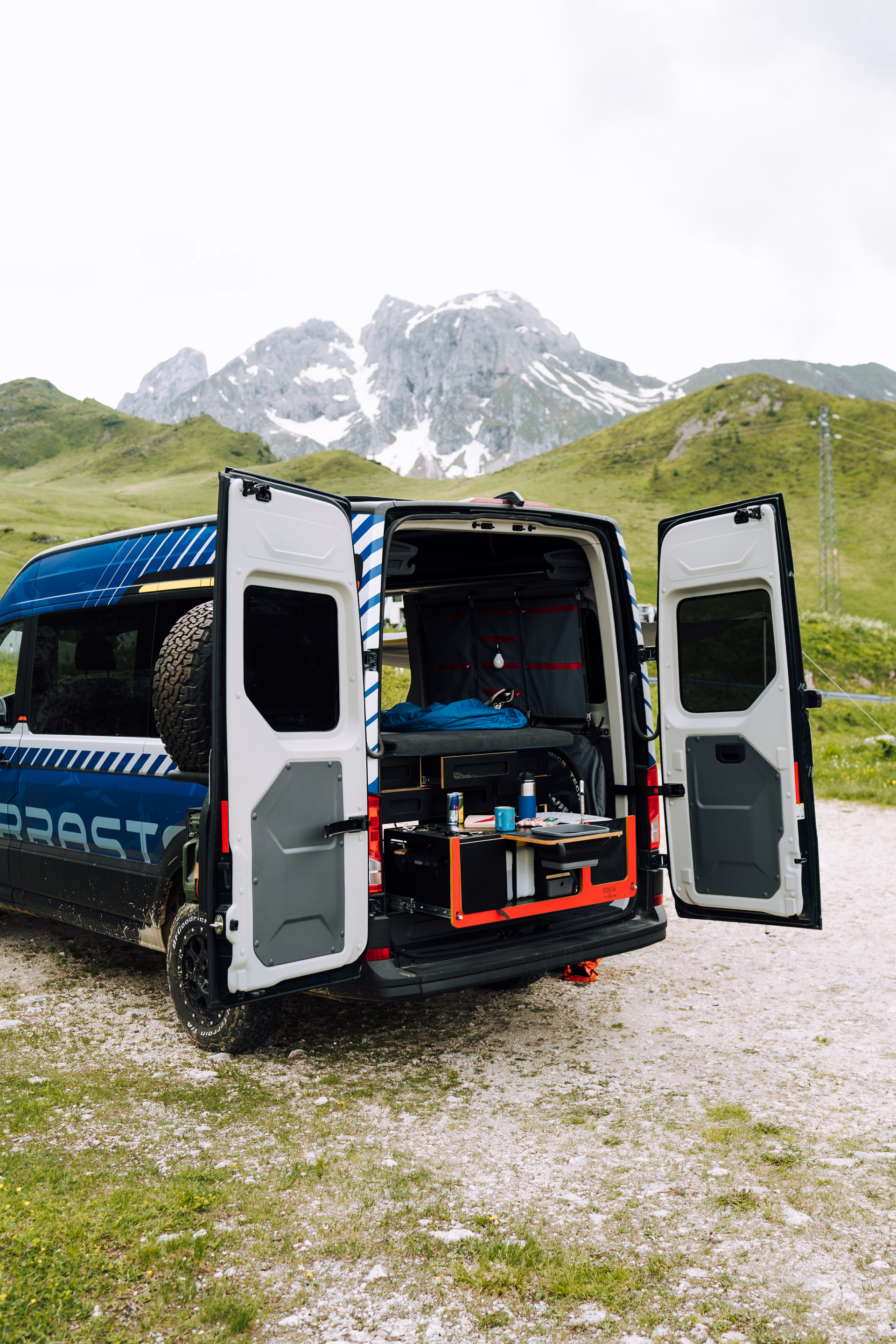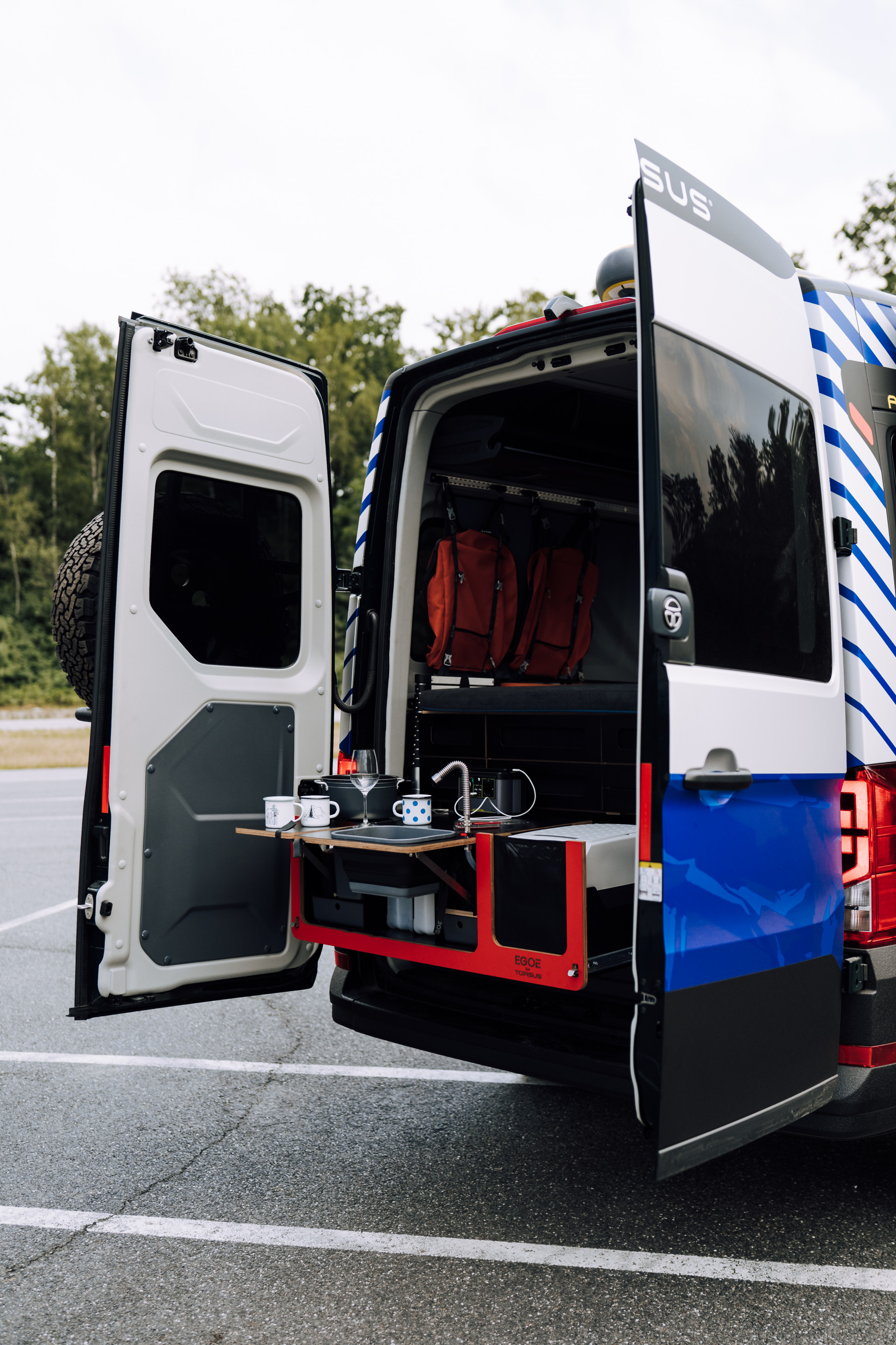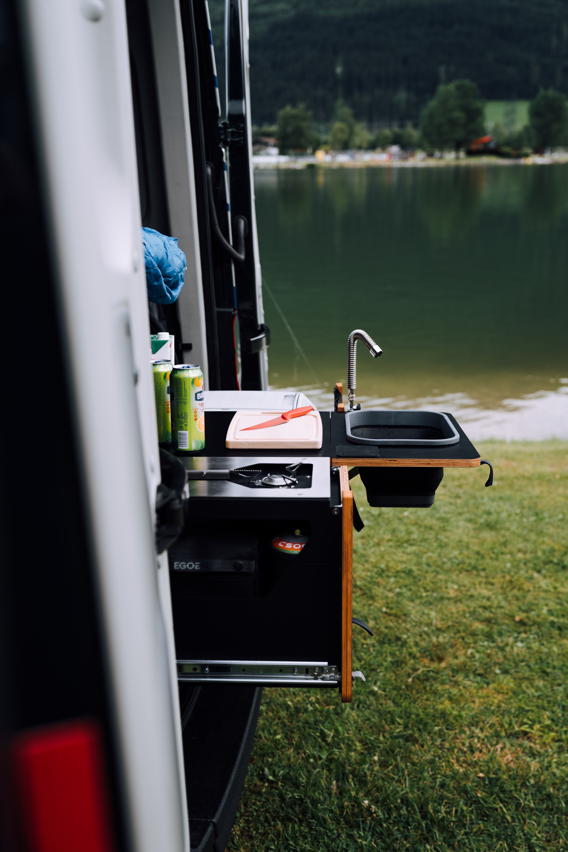 Das Besondere: Die Nestbox von Egoe. Ein raffiniertes Küchenmodul mit Kühlschrank, Kochfläche, Spüle und Stauraum, das sich komplett aus dem Heck herausziehen lässt. Hinzu kommt ein ausklappbares Bettmodul für zwei Personen, eine optional anbringbare Markise und Outdoor-Mobiliar. Alles, was man braucht, um Tage – oder Wochen – autark im Freien zu leben. Und das für einen Einstiegspreis von 130.000 Euro.