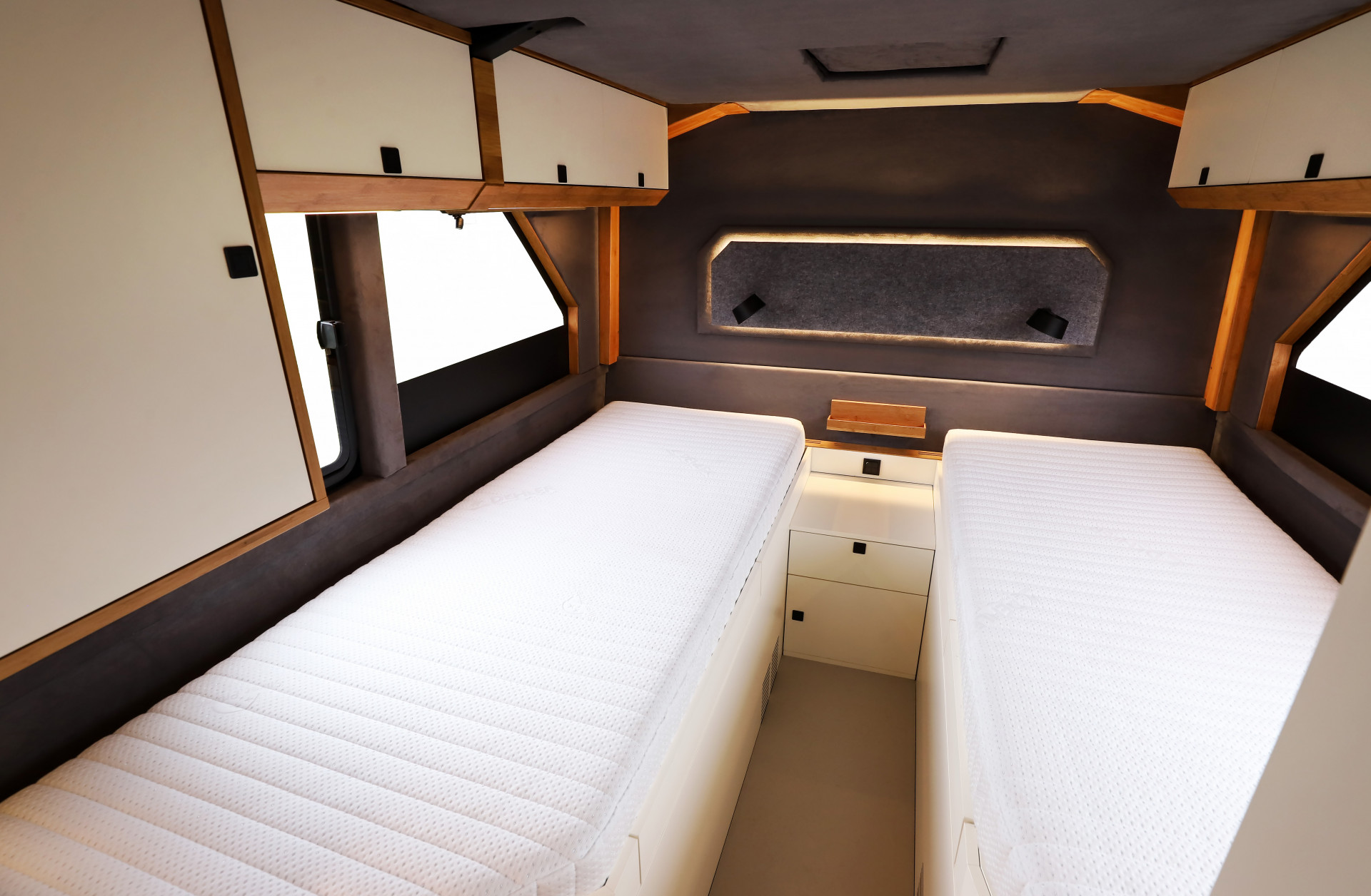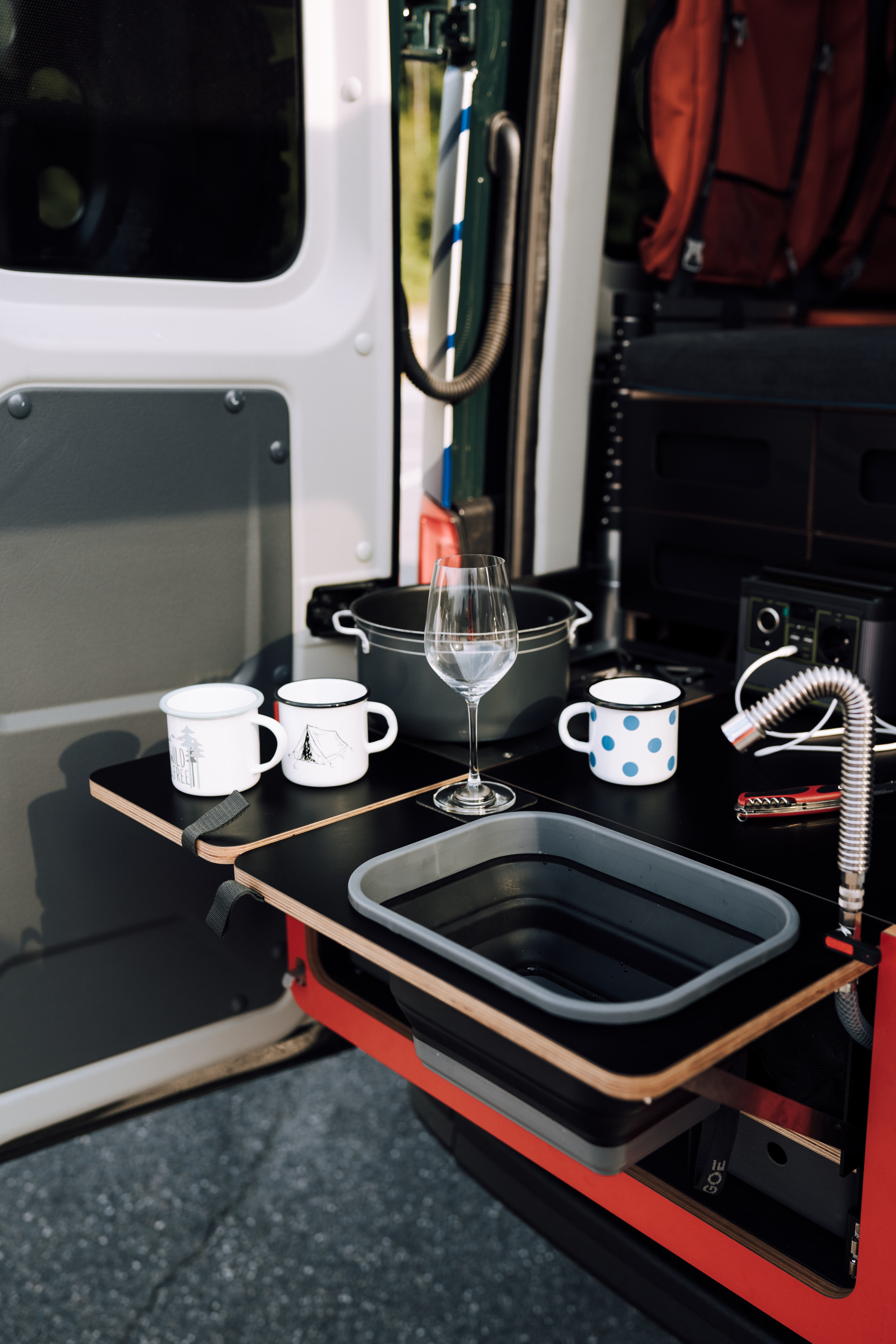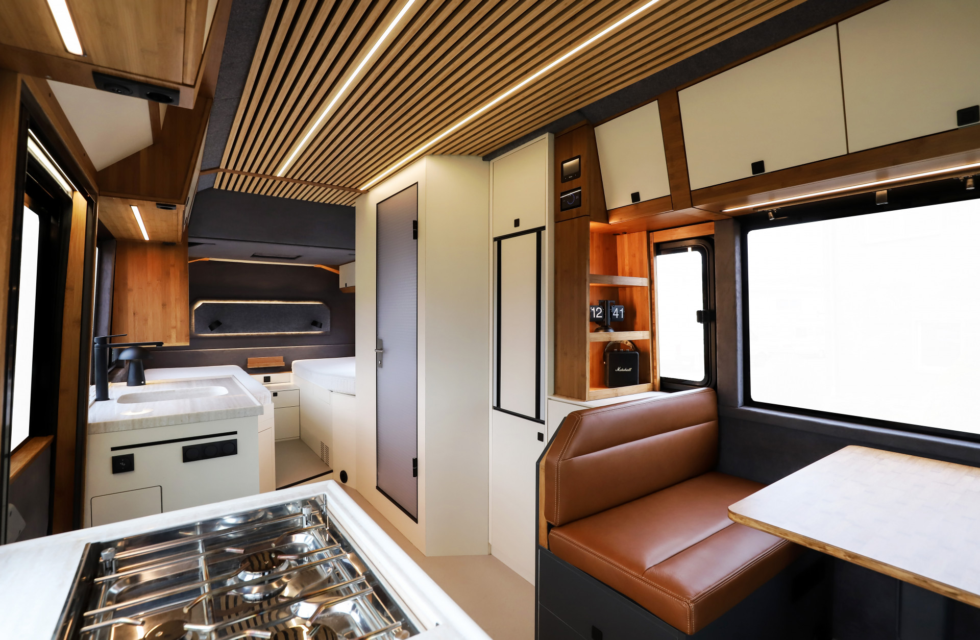 Das Besondere: Die Nestbox von Egoe. Ein raffiniertes Küchenmodul mit Kühlschrank, Kochfläche, Spüle und Stauraum, das sich komplett aus dem Heck herausziehen lässt. Hinzu kommt ein ausklappbares Bettmodul für zwei Personen, eine optional anbringbare Markise und Outdoor-Mobiliar. Alles, was man braucht, um Tage – oder Wochen – autark im Freien zu leben. Und das für einen Einstiegspreis von 130.000 Euro.