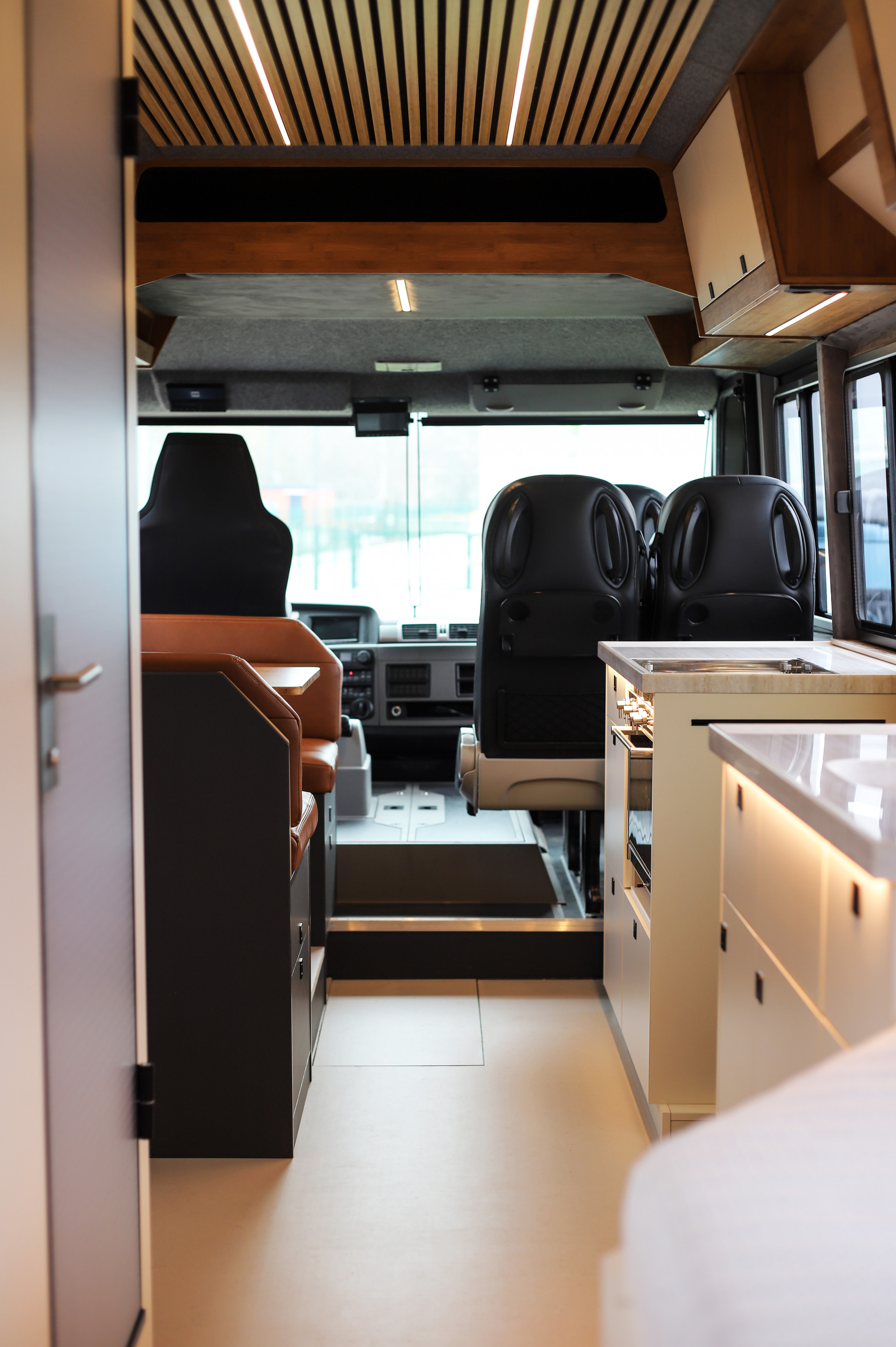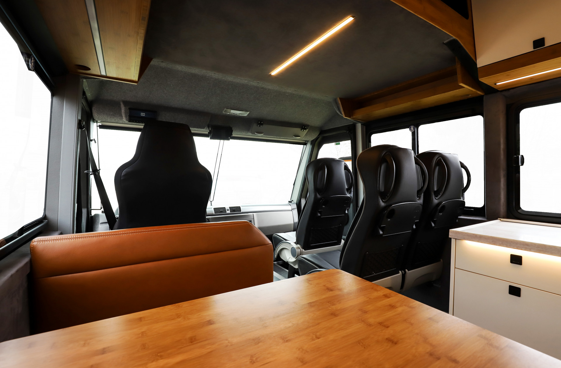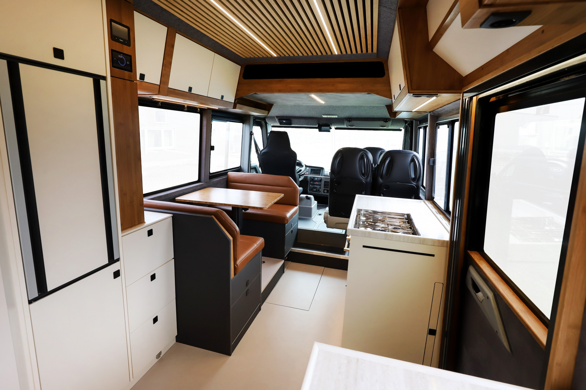 Aber hier hört die Geschichte nicht auf – sie beginnt erst. In Zusammenarbeit mit FES Sachsen und Dämmler wird aus dem Stahlkoloss ein rollendes Luxus-Chalet. Eine erhöhte Dachschale (+30 cm) bringt komfortable 2,20 m Stehhöhe. Innen wartet pure Behaglichkeit: Küche mit Induktionsherd, Kühlschrank, Spüle, Duschkabine, Toilette, High-End-Audio von Marshall, dimmbare LEDs und Panoramafenster für unvergessliche Ausblicke. Wer im Liberra schläft, wacht in den Alpen mit Sonnenaufgang im Blick auf – oder irgendwo im Nirgendwo mit Stille als einzigem Geräusch.