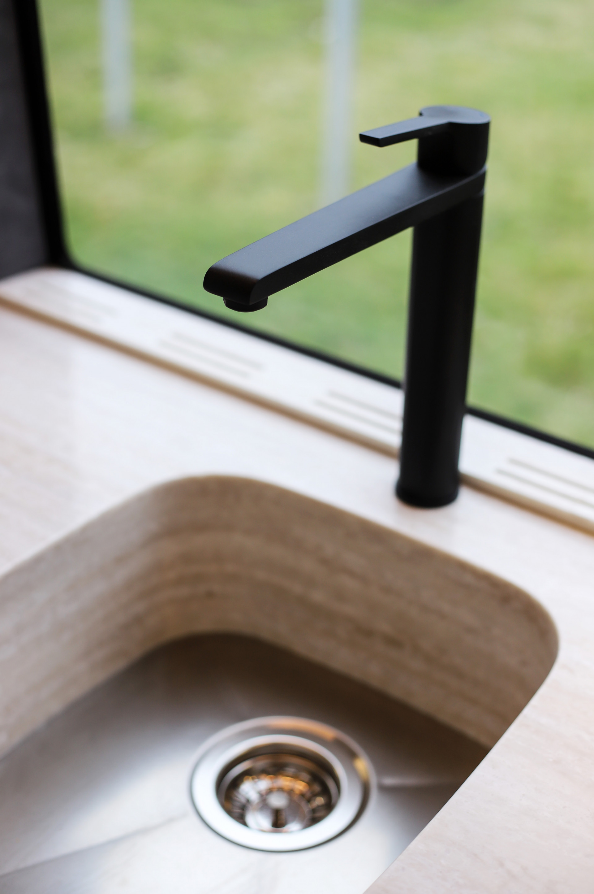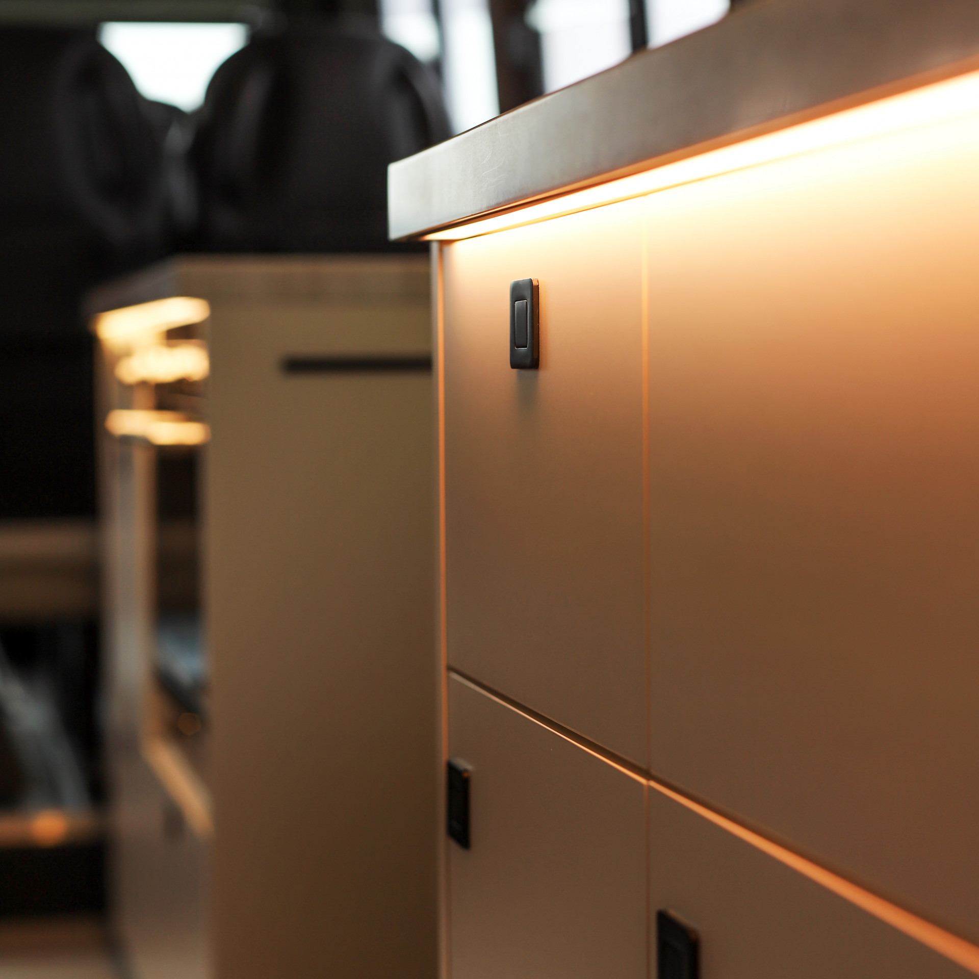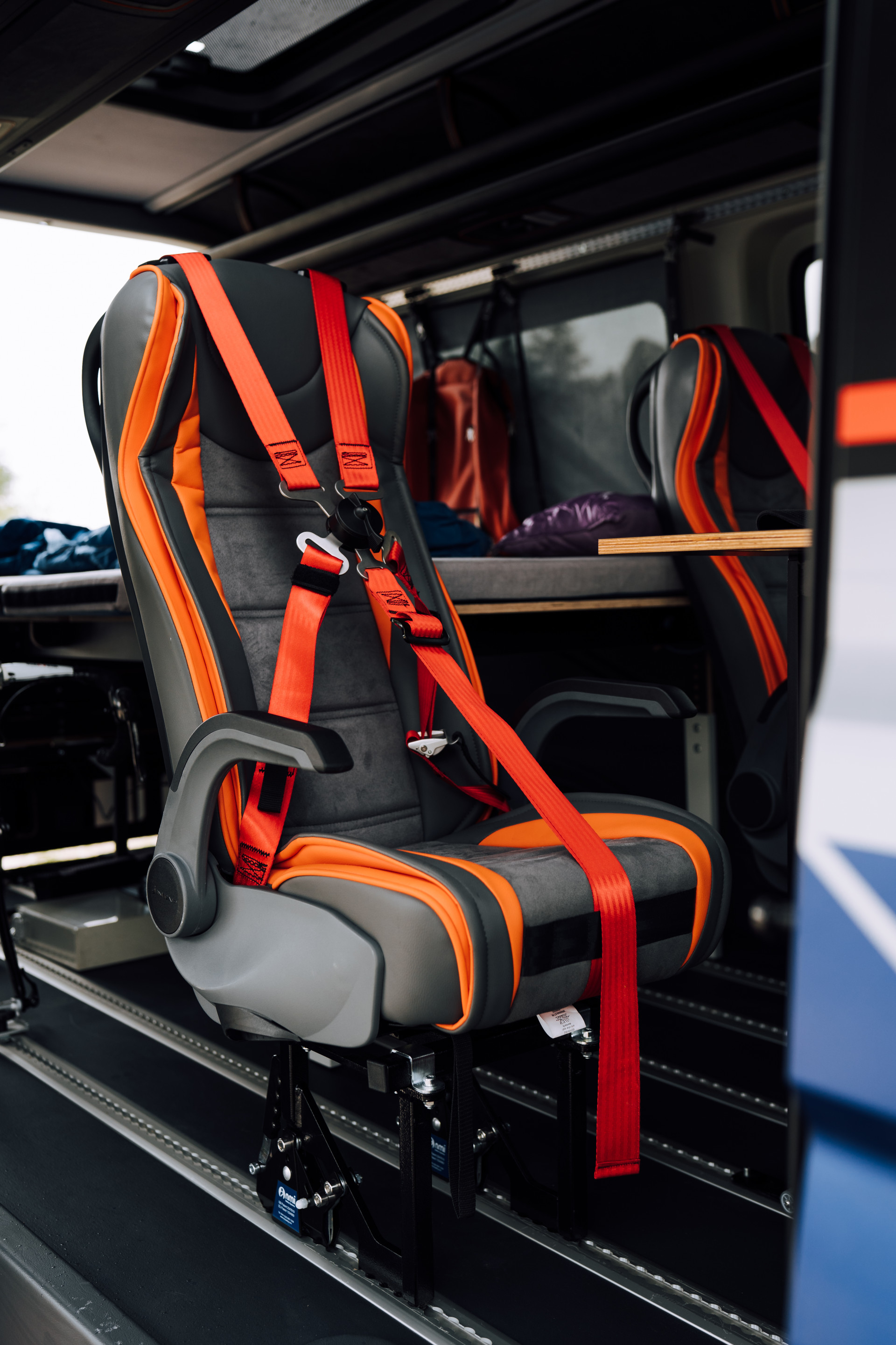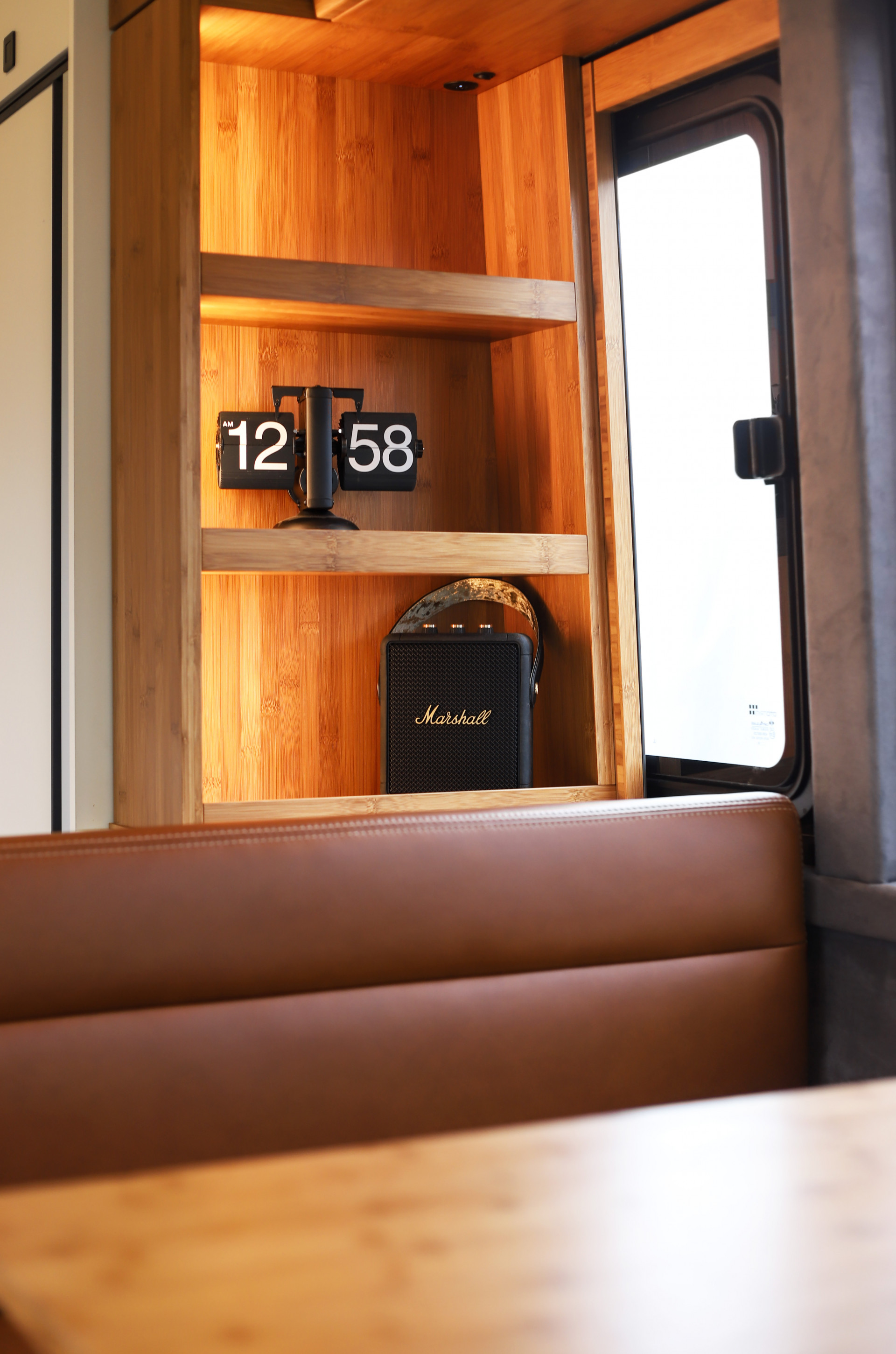 Aber hier hört die Geschichte nicht auf – sie beginnt erst. In Zusammenarbeit mit FES Sachsen und Dämmler wird aus dem Stahlkoloss ein rollendes Luxus-Chalet. Eine erhöhte Dachschale (+30 cm) bringt komfortable 2,20 m Stehhöhe. Innen wartet pure Behaglichkeit: Küche mit Induktionsherd, Kühlschrank, Spüle, Duschkabine, Toilette, High-End-Audio von Marshall, dimmbare LEDs und Panoramafenster für unvergessliche Ausblicke. Wer im Liberra schläft, wacht in den Alpen mit Sonnenaufgang im Blick auf – oder irgendwo im Nirgendwo mit Stille als einzigem Geräusch.