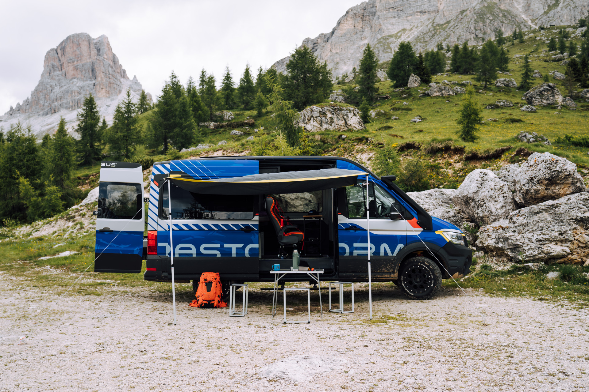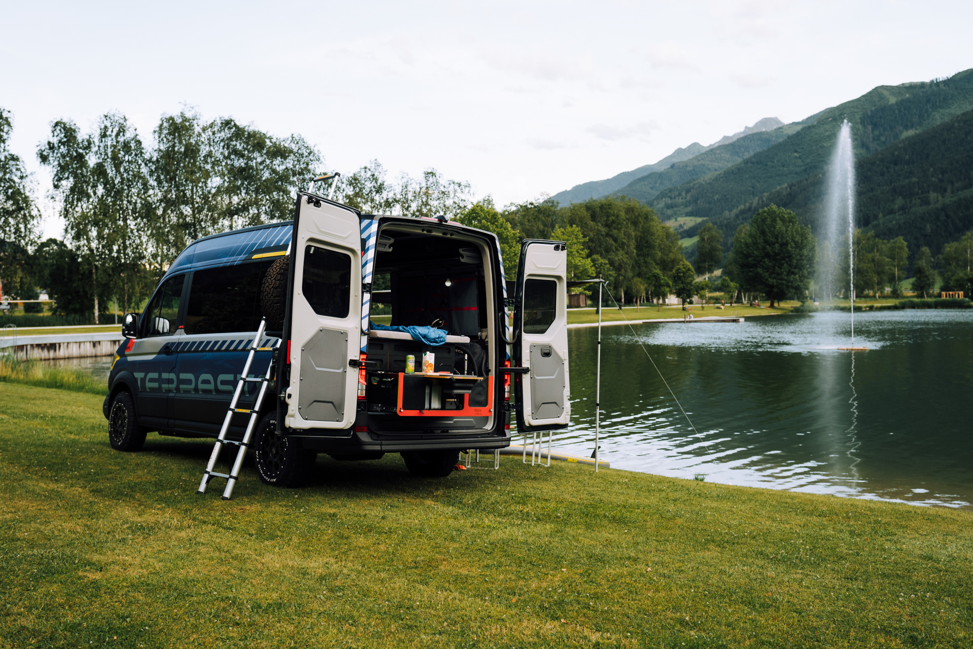 Der Terrastorm basiert auf dem VW Crafter bzw. MAN TGE mit 4Motion-Allrad und 2.0 Bi-Turbo-Diesel. Mit 250 mm Bodenfreiheit, robusten BF Goodrich Offroad-Reifen und einem Wading-Tiefgang von 52 cm meistert er Gelände, das andere Camper nur vom Drohnenvideo kennen.