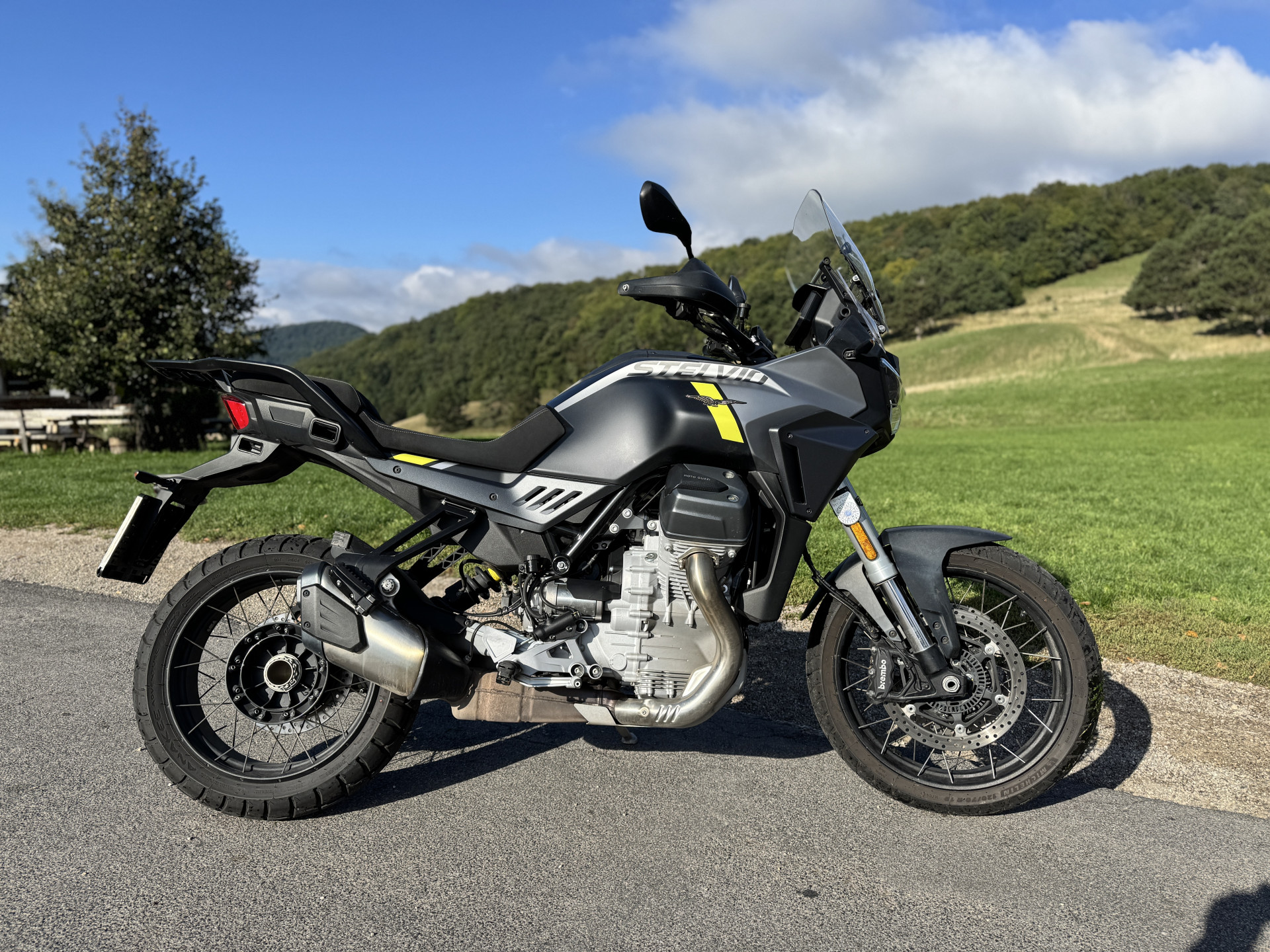 Auf der Straße zeigt die Guzzi, dass sie kein reines Schönwetter-Bike ist. Die Bremsanlage mit Brembo-Komponenten packt kräftig zu, unterstützt von einem sensiblen Kurven-ABS. Dazu gibt es fünf Fahrmodi, Traktionskontrolle, Tempomat und ein LED-Lichtsystem mit Kurvenfunktion. Wer es besonders modern will, bestellt das optionale Radarsystem mit Totwinkelwarner und adaptiver Temporegelung – ein Feature, das sonst eher in Premiumautos zuhause ist.