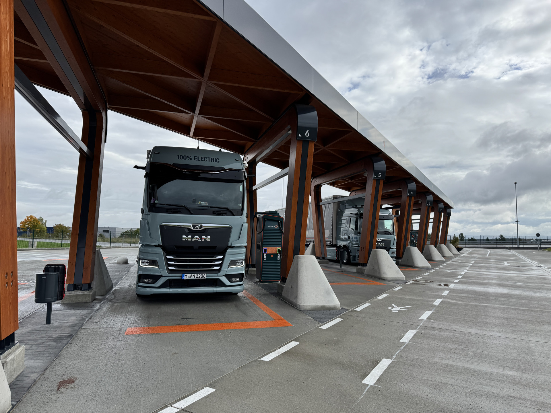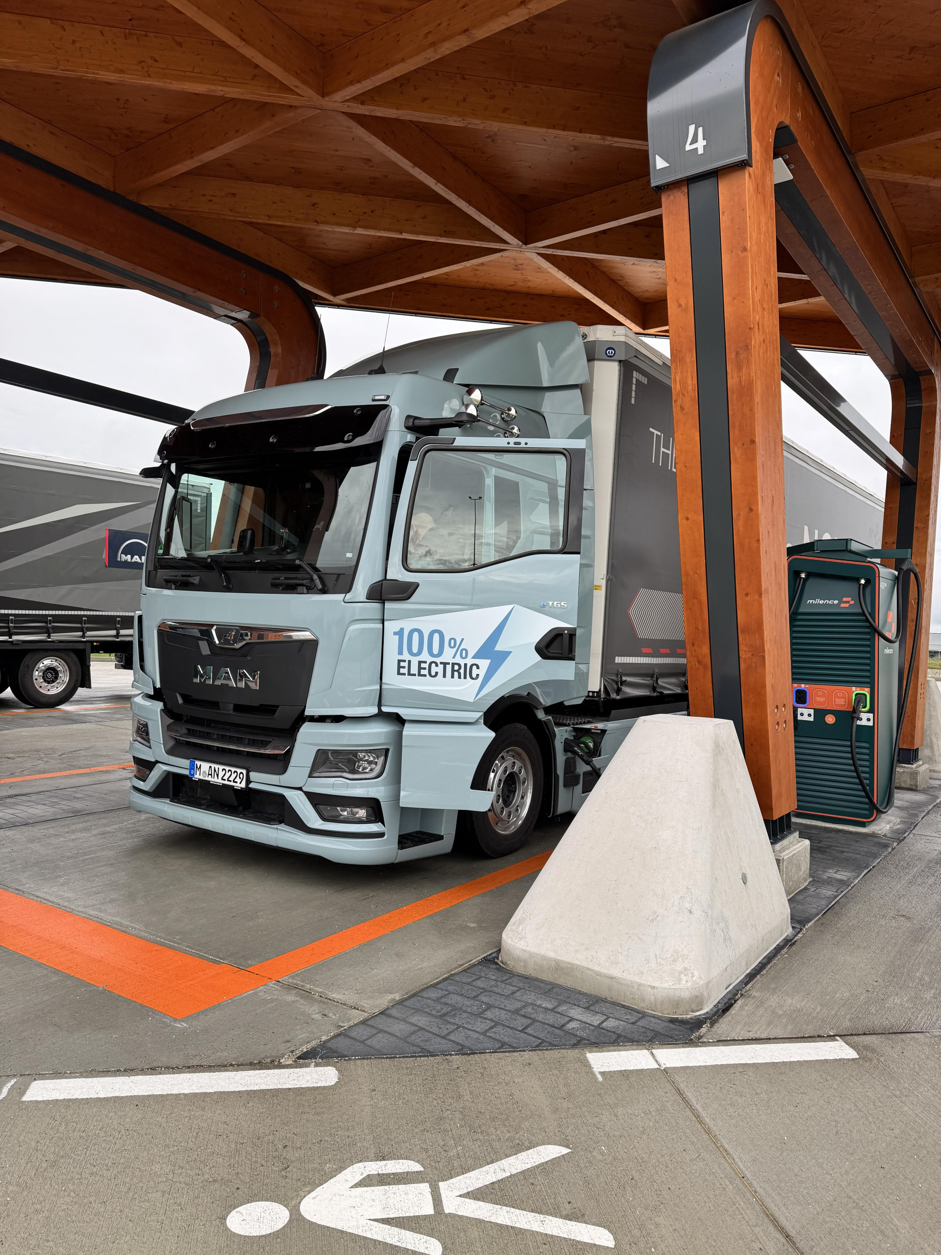 Ein Highlight des Tages war unser Halt im Milence Ladepark. Mit einer Infrastruktur, die Tesla-Fans zum Staunen bringen würde, boten uns die 8 Ladestationen mit je 400 kW Ladeleistung eine blitzschnelle Energietankstelle. Als Sahnehäubchen gab es exklusive, stylishe Toiletten und Duschen für die E-Lkw Fahrer – ein kleines, aber luxuriöses Detail auf unserem Weg. Die Botschaft ist klar: Als E-Fahrer bist du VIP.