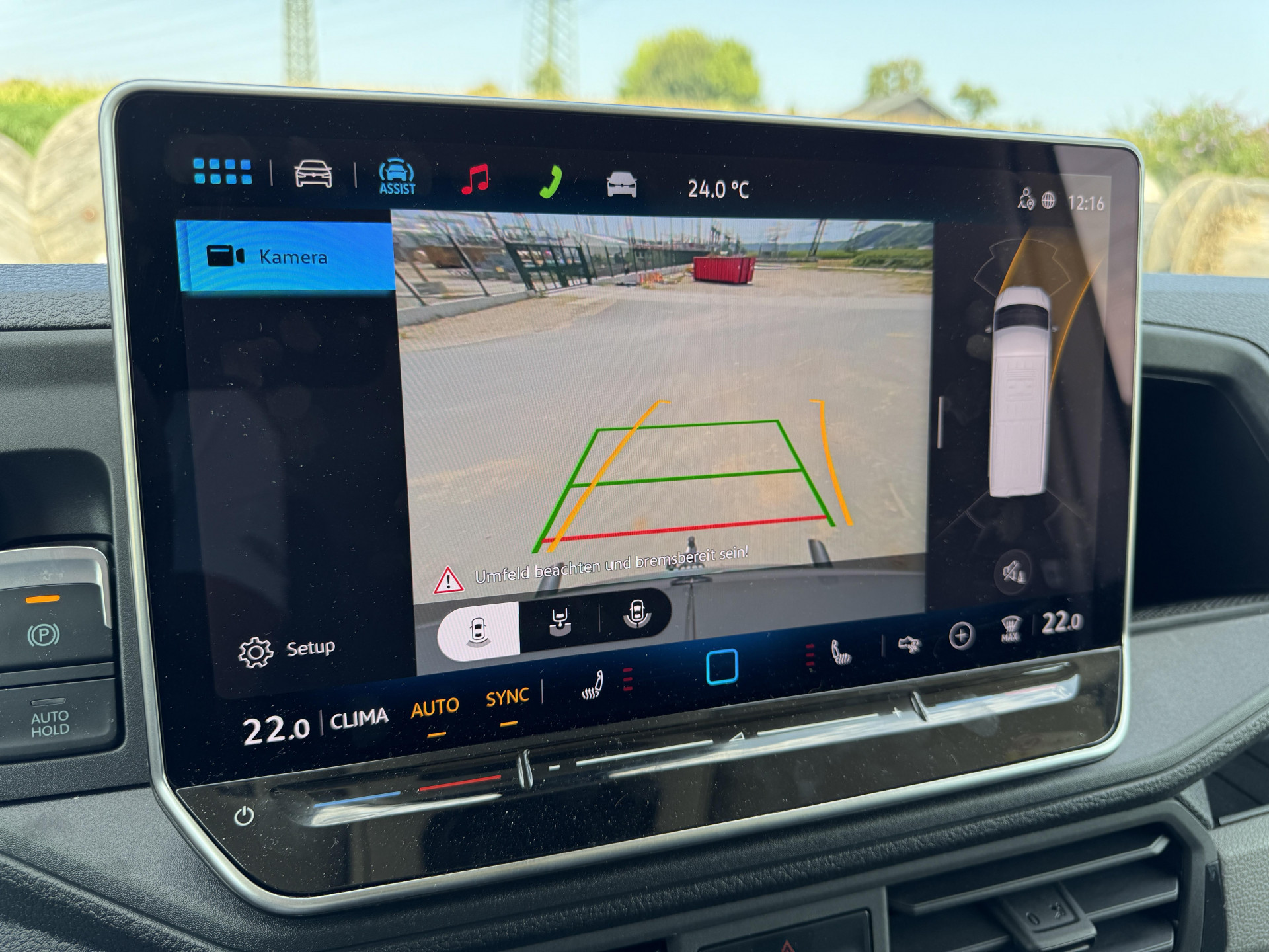 Im Testwagen treibt Volkswagen den Komfort konsequent weiter. Der Fahrer sitzt auf einem „ergoComfort“-Schwingsitz, der auch lange Tage auf der Baustelle oder im Lieferverkehr erträglich macht. Beheizte Vordersitze und Klimaautomatik „Climatronic“ sorgen dafür, dass es im großen Fahrerhaus im Winter nicht kalt und im Sommer nicht zur Sauna wird. LED-Scheinwerfer inklusive Nebelscheinwerfern mit Abbiegelicht verbessern die Sicht bei Dunkelheit deutlich – ein entscheidender Sicherheitsfaktor, wenn man viel bei Nacht oder in der dunklen Jahreszeit unterwegs ist.
