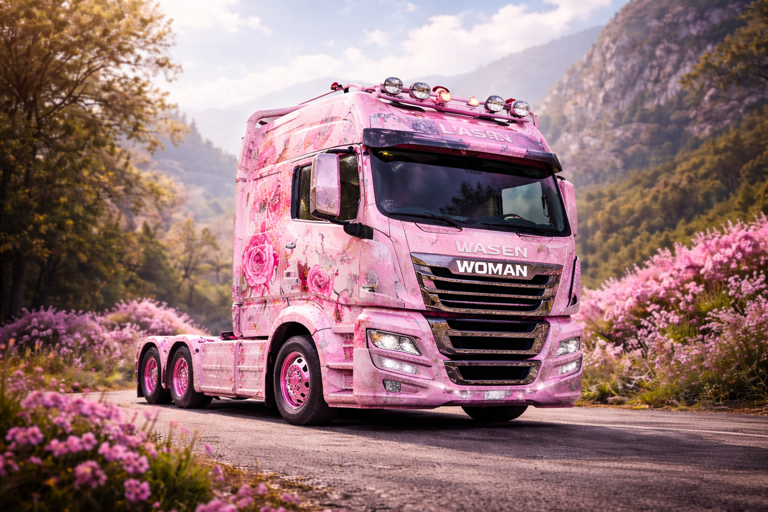 Auch optisch geht WOMAN Trucks einen eigenen Weg. Während klassische Nutzfahrzeuge meist auf nüchterne Gestaltung setzen, experimentiert der Hersteller mit floralen Designelementen, sanften Farben und glitzernden Details.